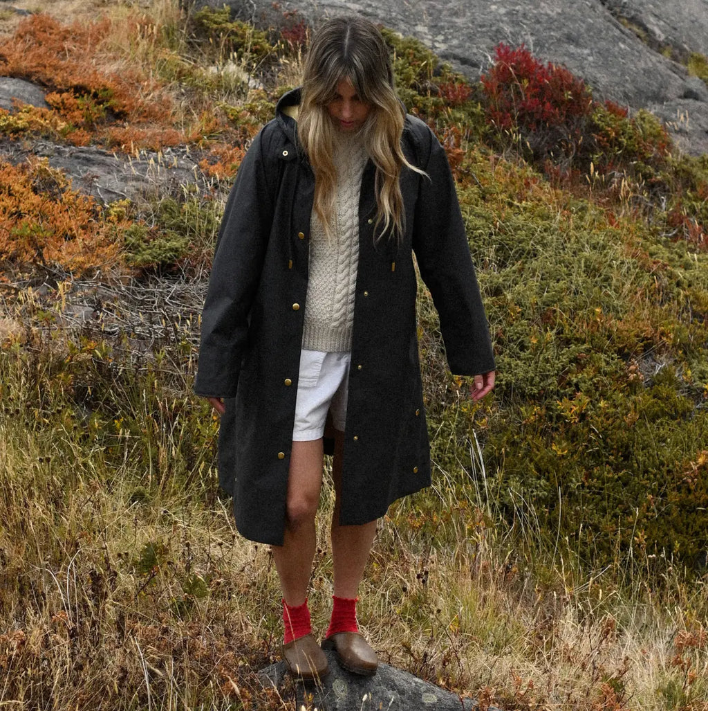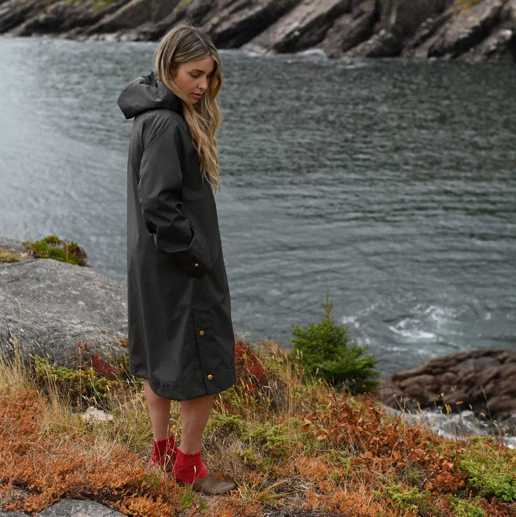 The Waterproof Poncho is a relaxed, all-weather outer layer with a gentle A-line silhouette and full-coverage design. Cut to fall just below the knee, it features sloped raglan sleeves, side vents with adjustable tabs (ideal for layering or maternity wear), and a roomy fit that moves with you. The fully waterproof snap closure and attached hood keep you dry in every direction. Adjustable cuffs and two deep side pockets make this piece as practical as it is timeless.