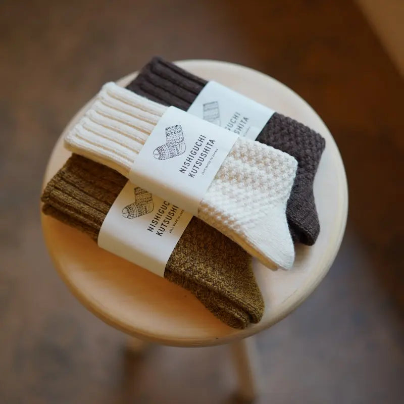 Thick, insulating and made for real cold-weather comfort, these Japanese boot socks are knit with a sturdy blend of wool and reclaimed cotton fibres. The dense, cushioned knit holds warmth beautifully while staying breathable enough for long days outside. They’re the perfect partner for winter boots, forest walks or any chilly morning layered with your fairechild.